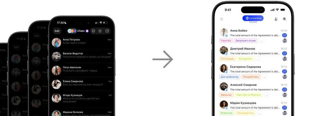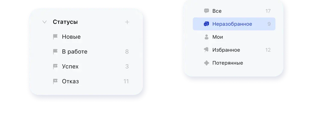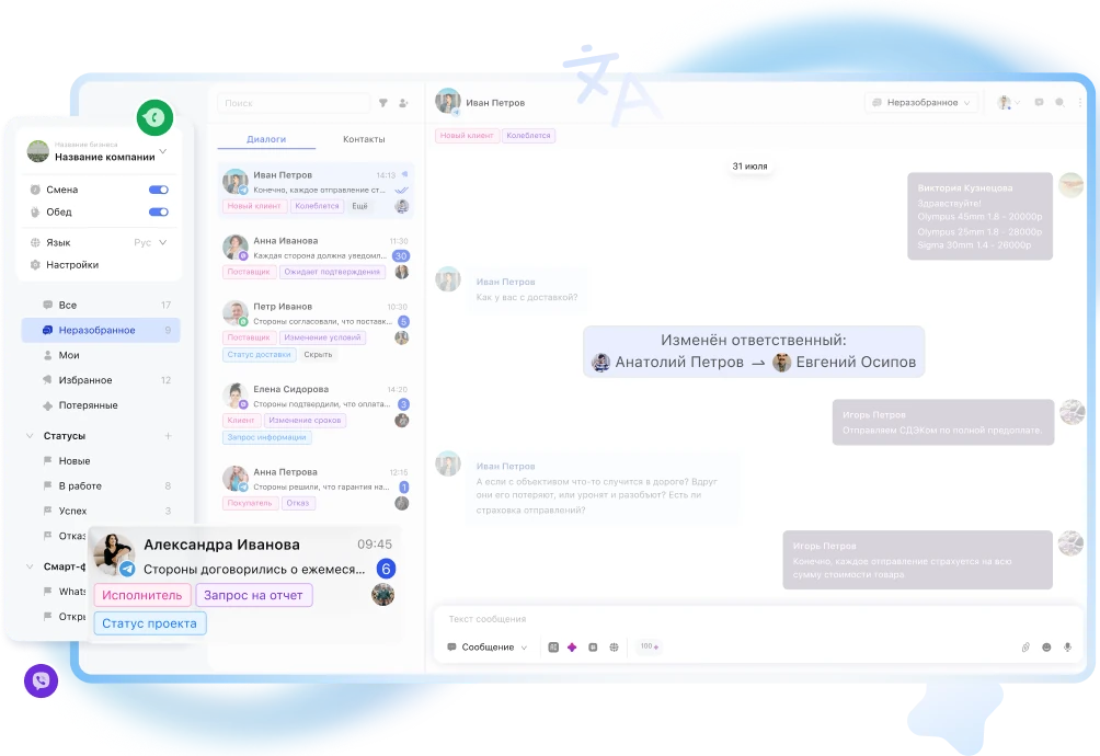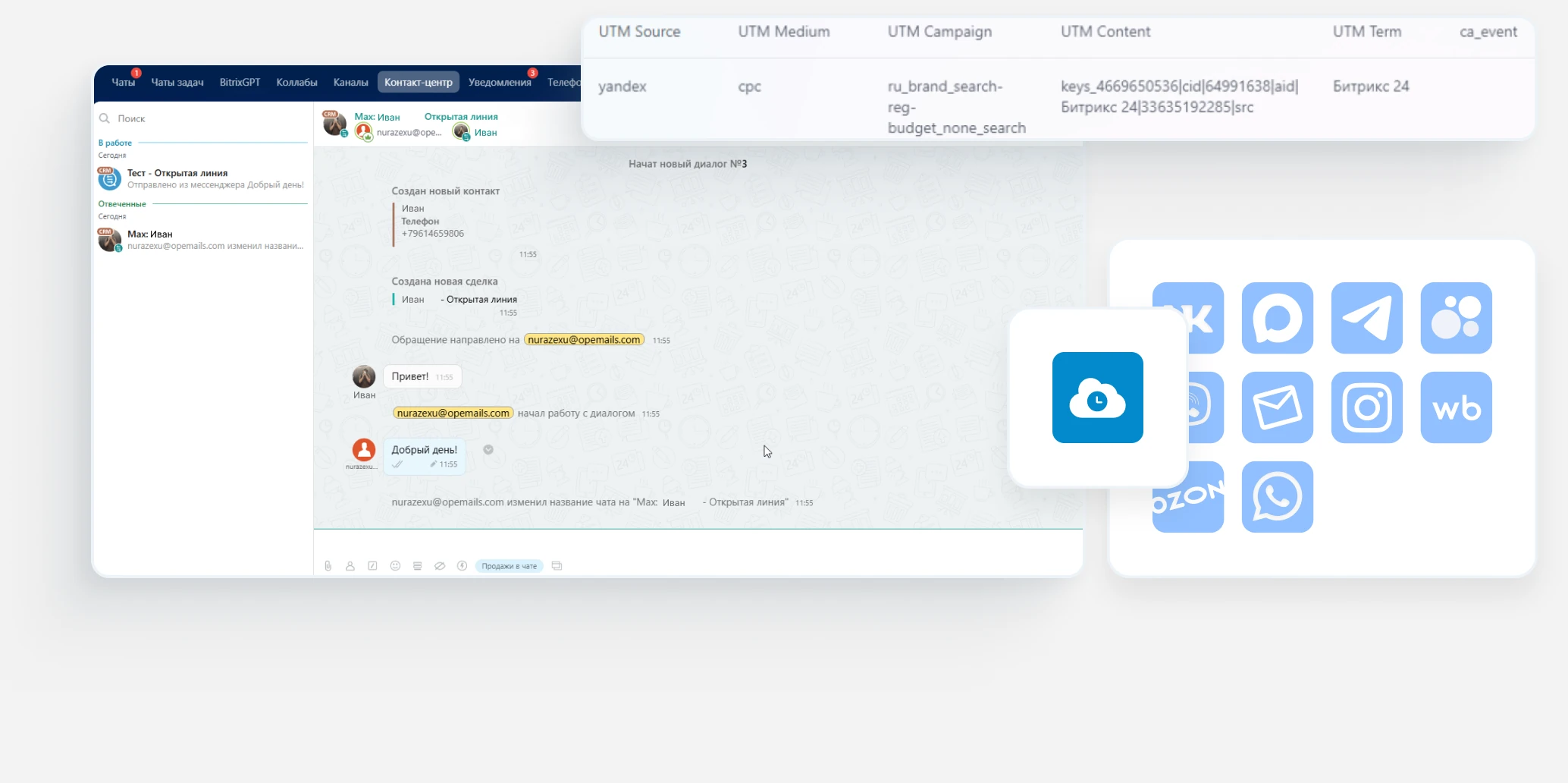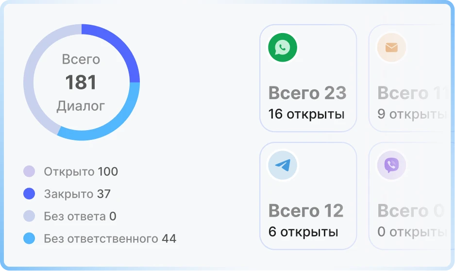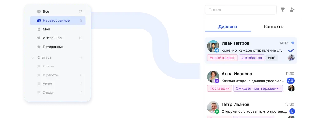 - Объединение всех обращений из мессенджеров, соц. сетей в одно окно