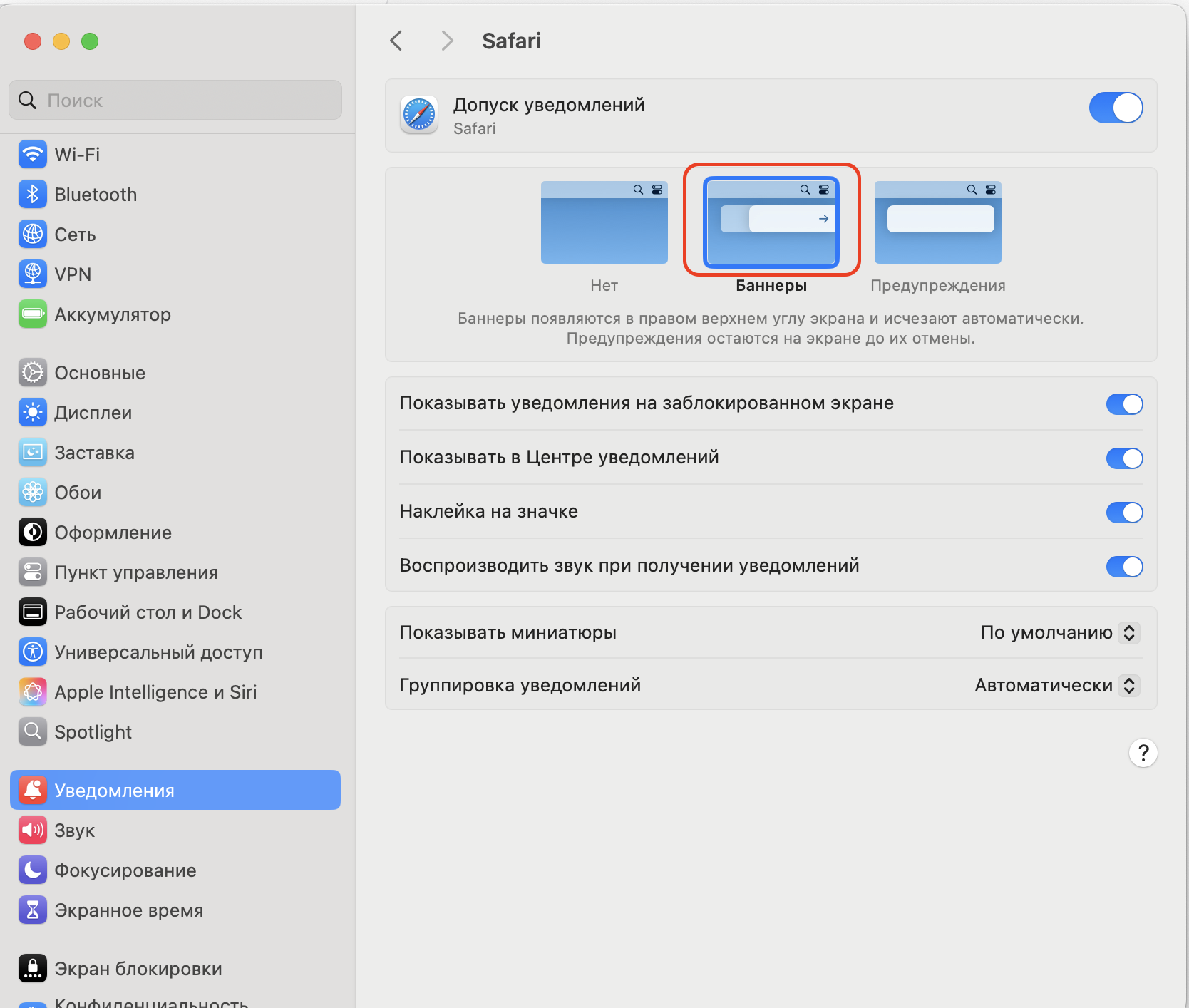 3. Включите:  разрешить уведомления (баннеры или оповещения)