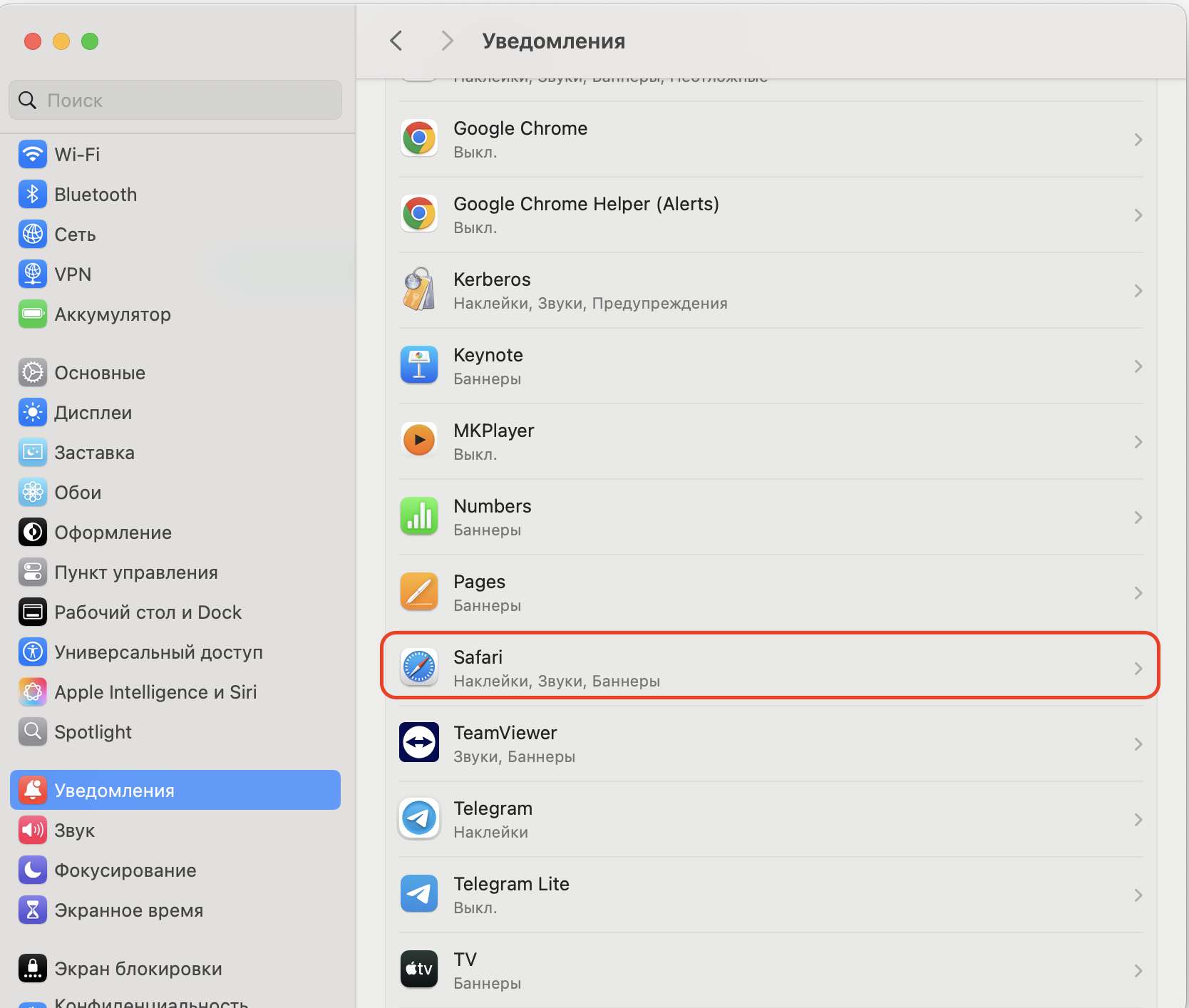 2. Нажмите Уведомления и найдите свой браузер в списке (например, Safari).