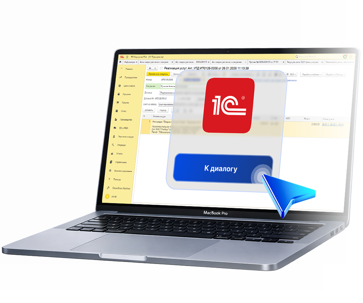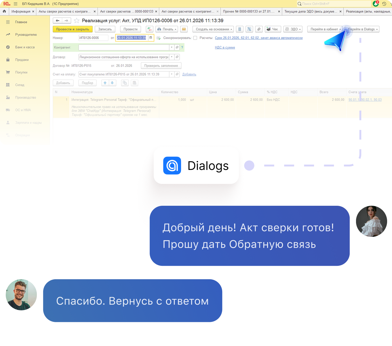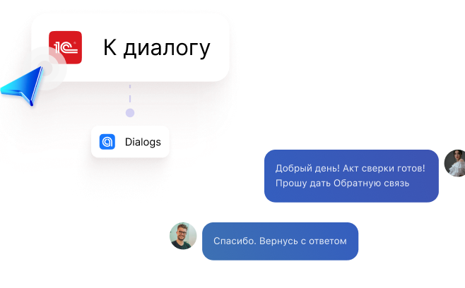 Message your counterparty first directly from the 1C interface. Transfer a dialog to the right employee. Receive notifications about document status changes right from the chat