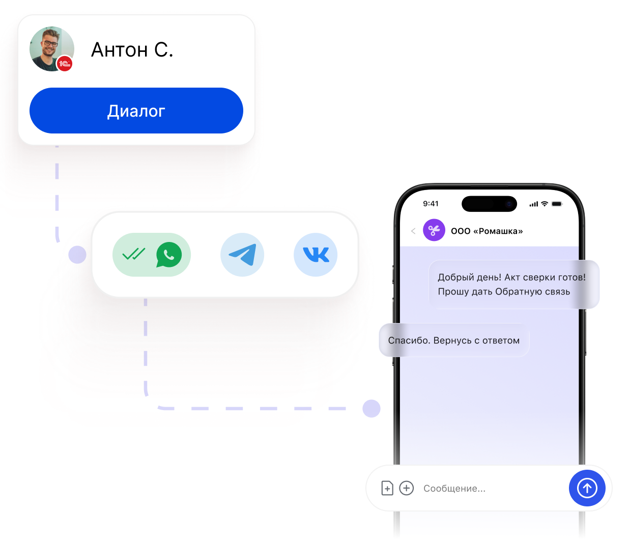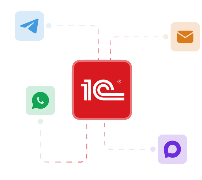 Communicate with clients from 1C in one click. No switching, with full dialog history. Stop wasting time searching for contacts in messengers — invest your resources in what matters