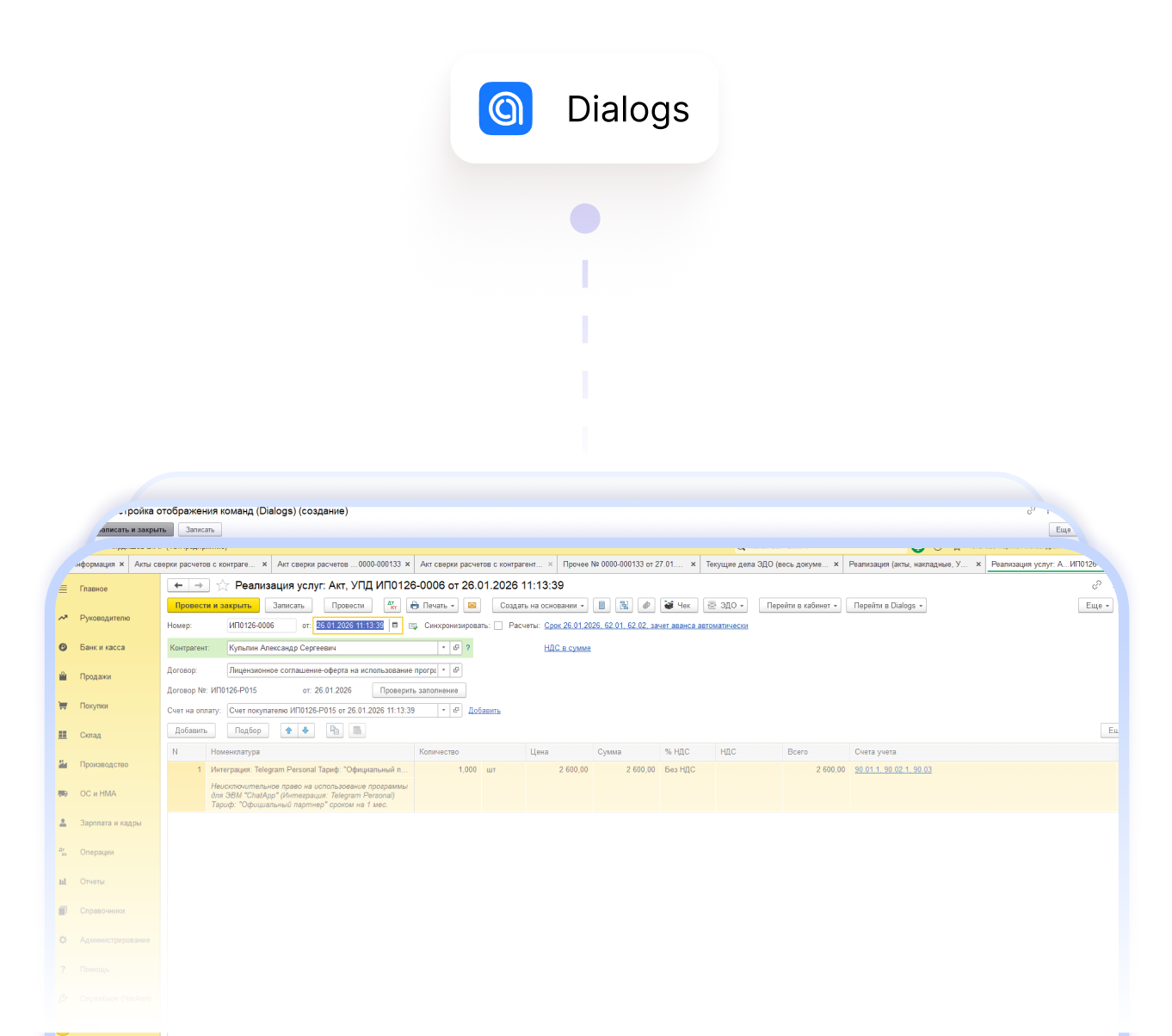• We place the "Dialog" button exactly where your team needs it: in the counterparty card, in the Sales Order, Invoice, or Purchase Order document, etc.