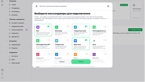 From 1C you can instantly start a dialog with a client by phone number or email. The system will suggest where to write — email, Max, WhatsApp, or Telegram