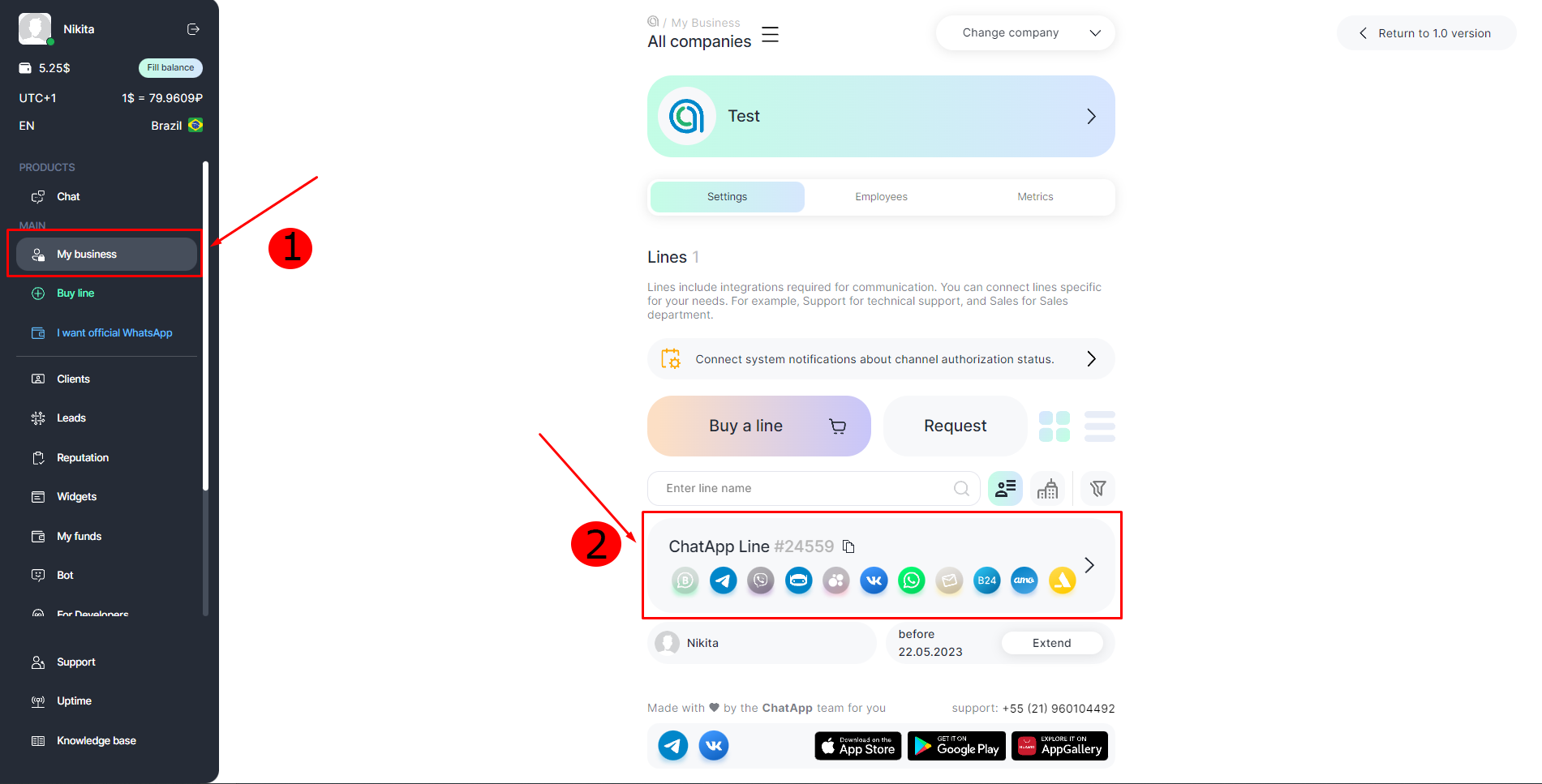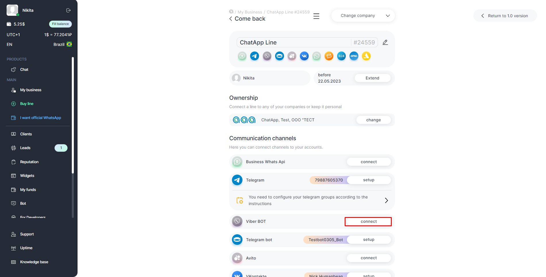 To receive and reply to messages from Viber, after registering in ChatApp, you need to buy a line with the Viber bot channel and set up the bot connection: