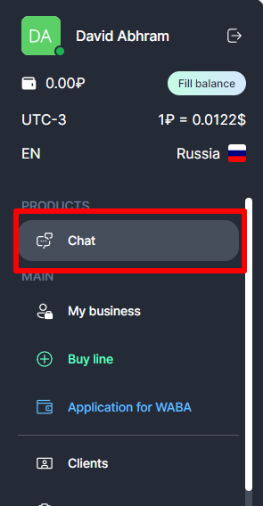 1. Go to the ChatApp Dialog window or use the «Chat» section in your personal account.