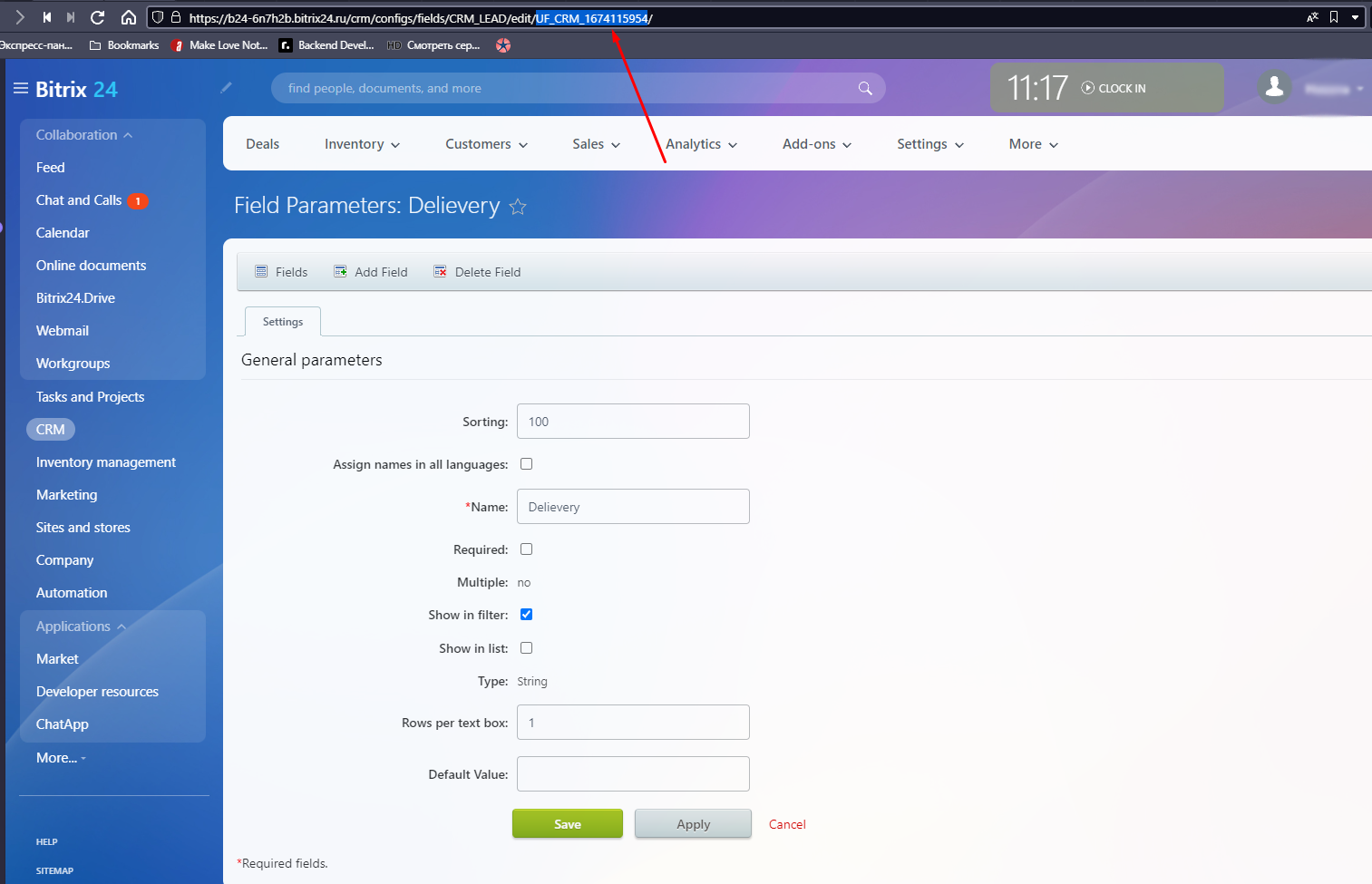 - In "key" enter "ID" and the field ID in Bitrix24, entered in square brackets [ ] so that Bitrix24 understands which card and which field to change.