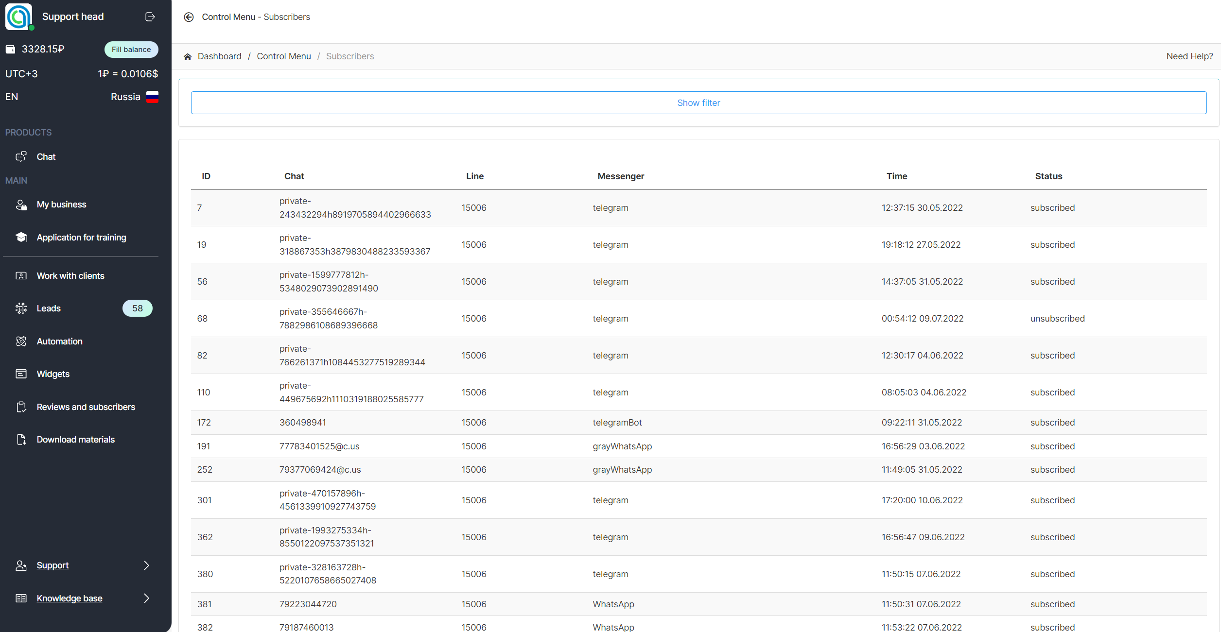 The subscriber ID is fixed in the subscriber's table; the number of the license that was used when sending the offer to subscribe; the messenger through which the “/Subscribe” or “/Unsubscribe” command was sent, as well as the status.