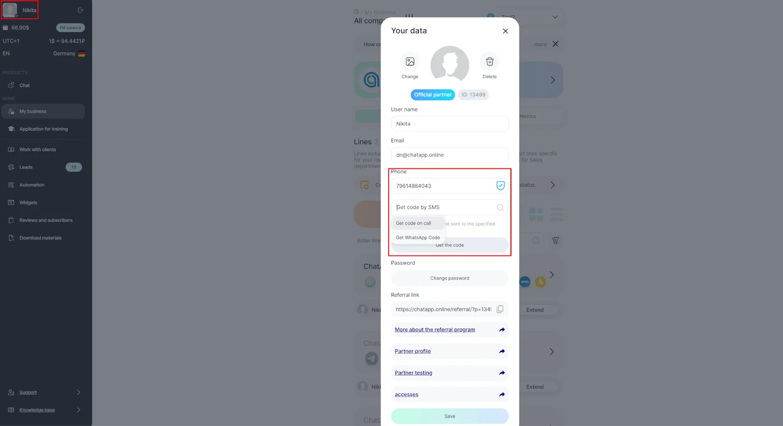 6. Press "Get code". The specified number will receive a call and the robot will dictate the verification code;