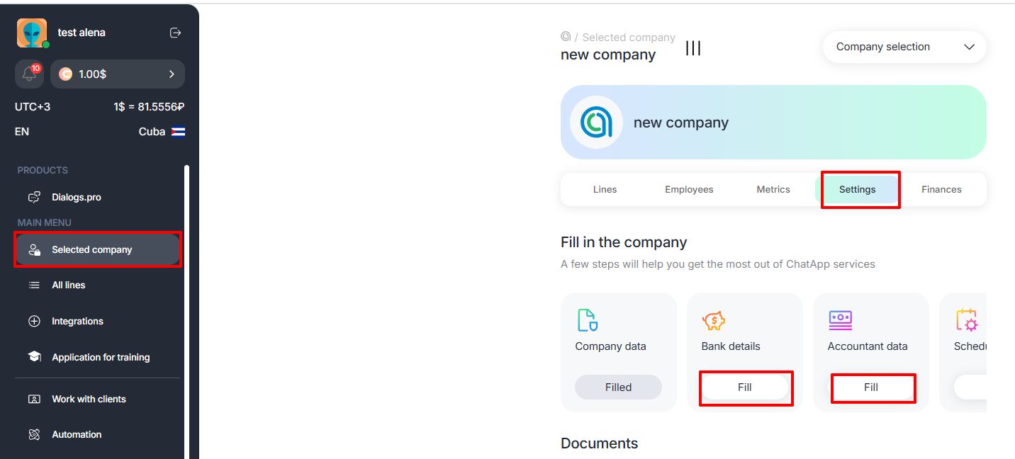 3. Add information about the organization in the Fill in the company section. To open the window for entering data, click on the Fill button.
