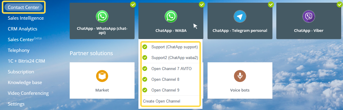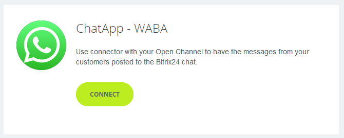 After installing the ChatApp application in the Bitrix24 marketplace, ChatApp connectors are created in the «Contact Center» section to configure channel connections to open lines: