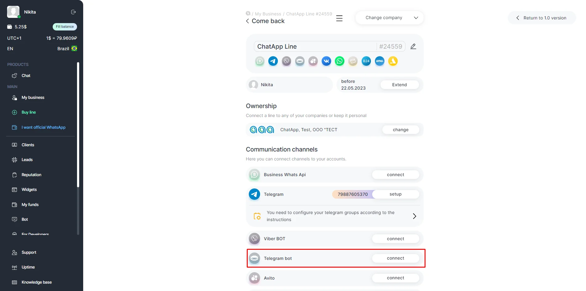5. The username of the bot will be displayed in the line. Click on setup to view the token, name, username of the bot and get a link to the bot in Telegram.