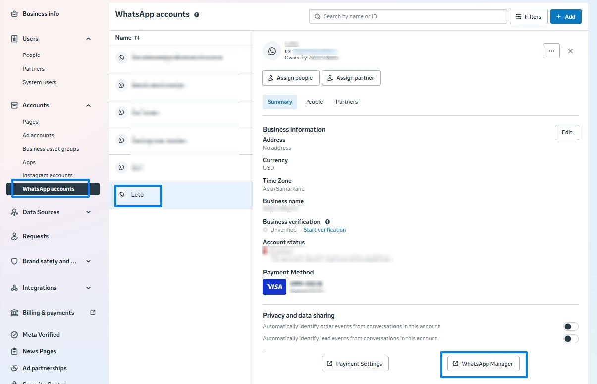 - Go to "WhatsApp Accounts", select the desired account and click "WhatsApp Manager" in the lower right corner.
