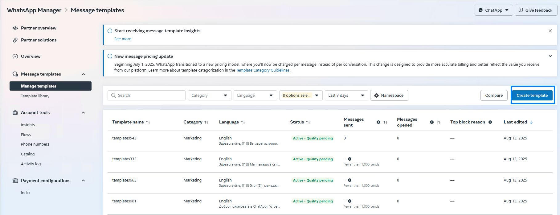 The status can be viewed in the "Message Templates" section. After the template is approved, it can be used to send messages.