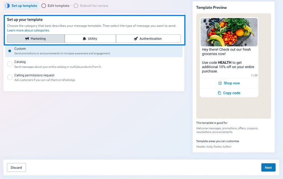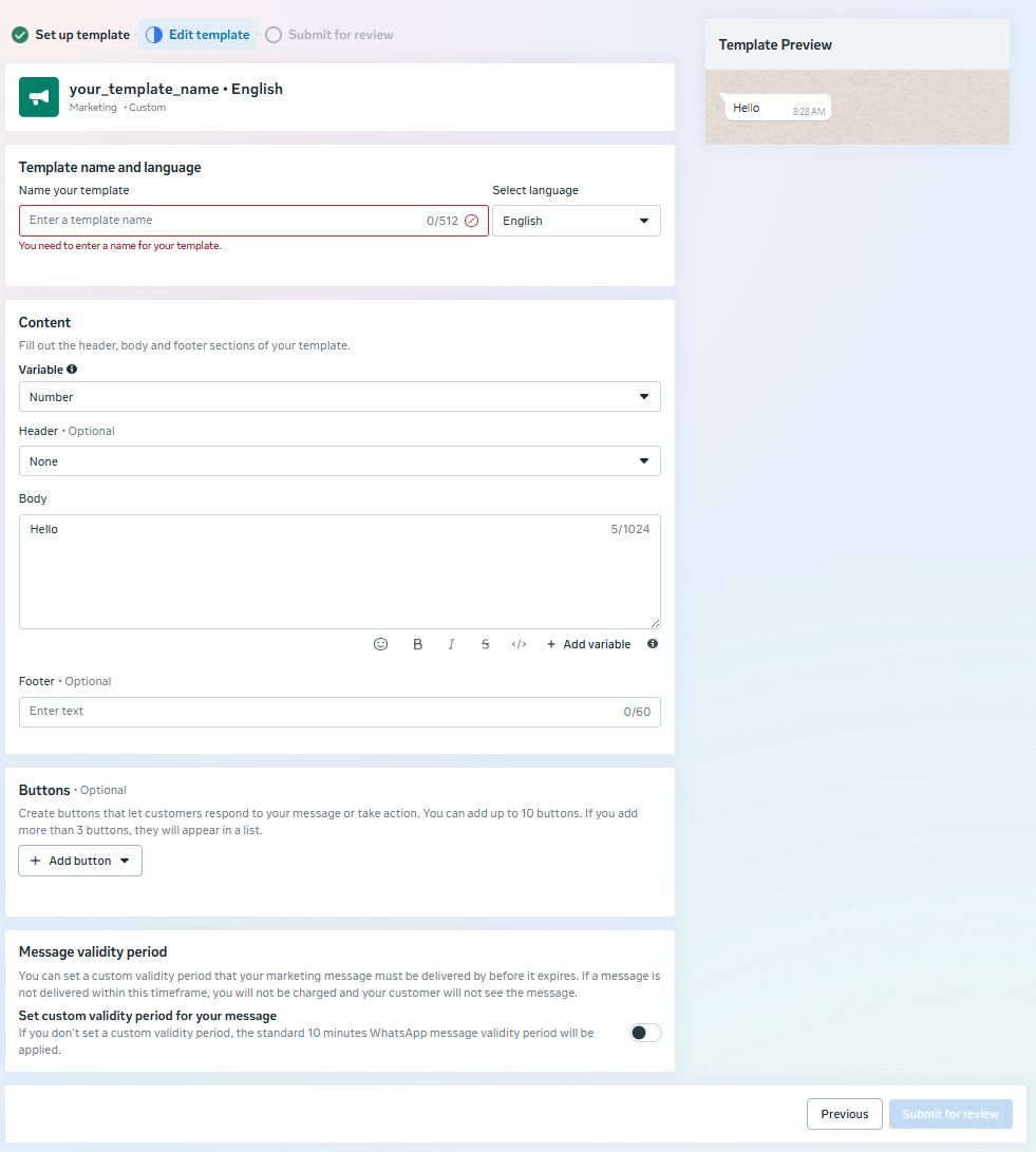 Content samples — if the template contains variables or media files, you need to add an example of the content. This will speed up the template verification. Make sure that the examples do not include real customer information.