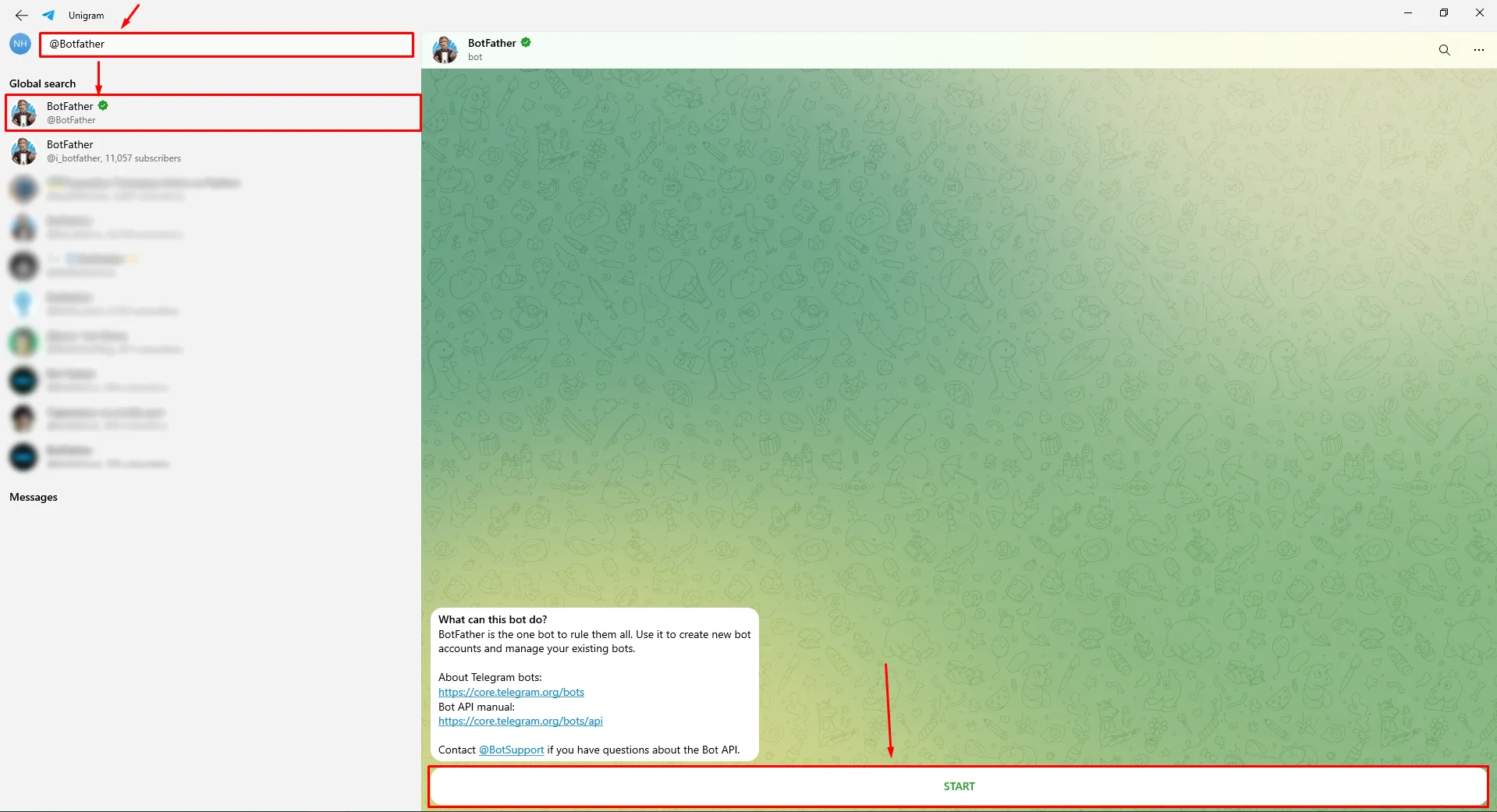 2. In the search bar enter the name @BotFather - this is a universal tool for creating bots. After that, press the /Start button and follow the further instructions;