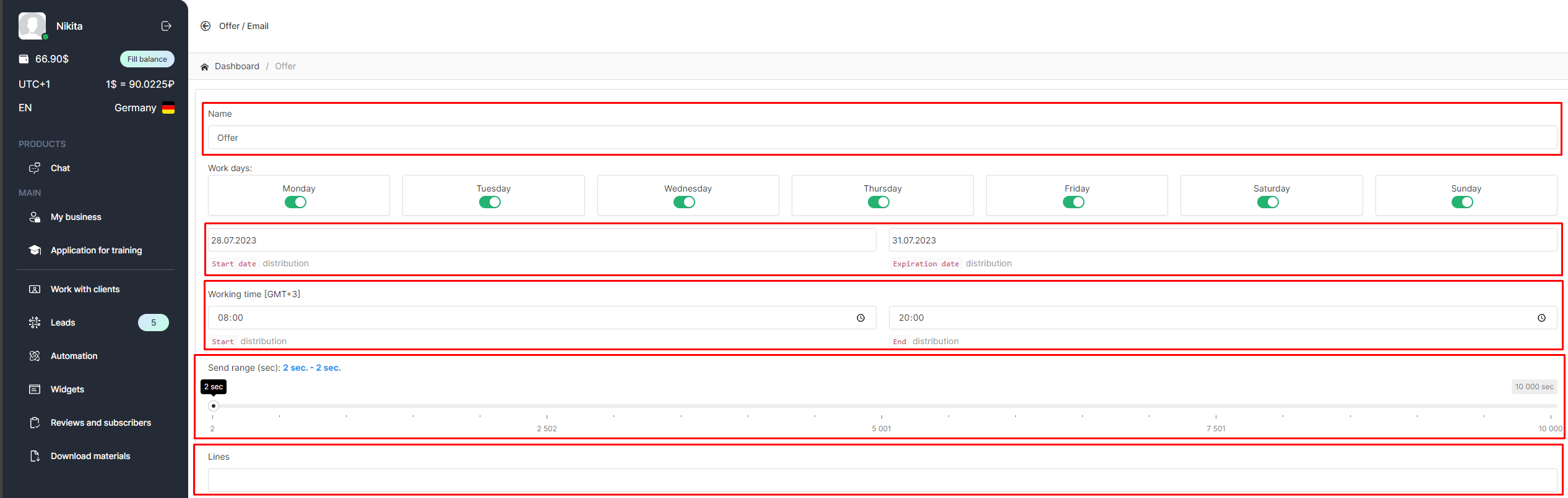 7. In the "Send range" section, select a delay when sending emails: this way you can avoid blocking when sending numerous emails.