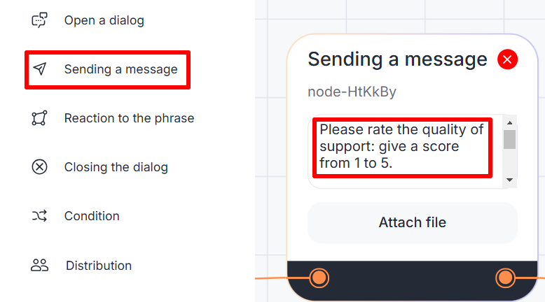 The block can be used, for instance, in a technical support scenario. After the dialog is closed, the bot will send a message to the client requesting a rating and save the response in the "Feedback" field within the "Metrics" section using the "Rating Collection" block. Depending on the given rating, an appropriate follow-up message will be sent. Then, the bot will ask the client to provide detailed feedback on the support service and save it in the "Feedback" field within the "Metrics" section using the "Feedback Collection" block.