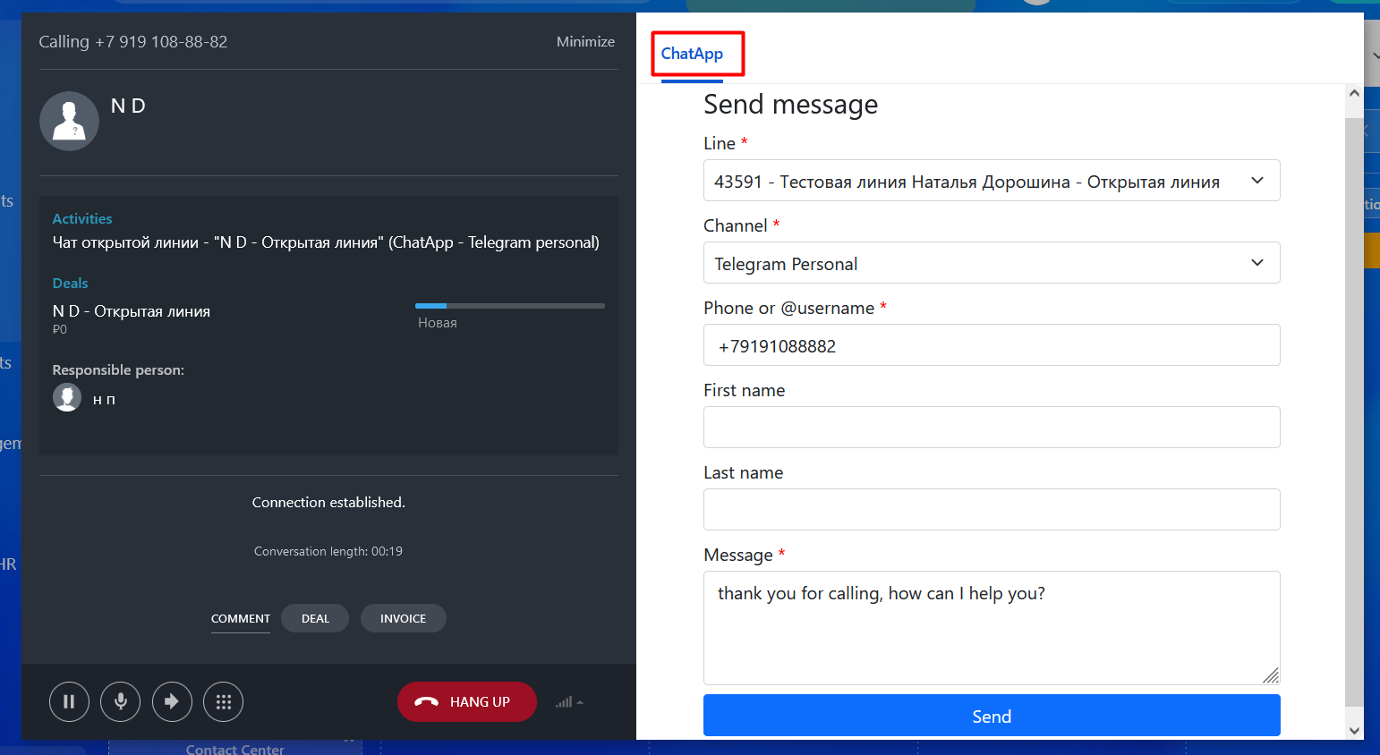You can send a message to the client during and after a call in Bitrix24. This may be useful to create a dialog for quick communication with the client.