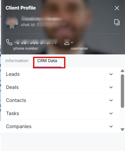 From the dialog, it is possible to work with data, and tasks from CRM, and view detailed information on a client.