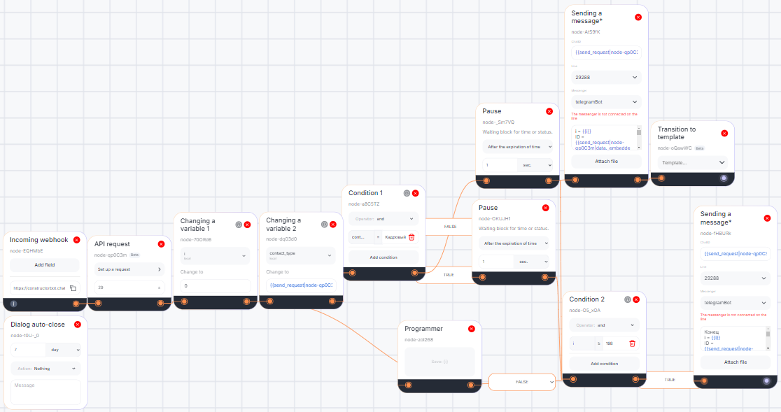 If false, connect to the Sending message 1 block. - Sending message 1 - send a message via ChatID using the result of the API request: {{...data._embedded.contacts[i].custom_fields_values[2].values[0].value}}.