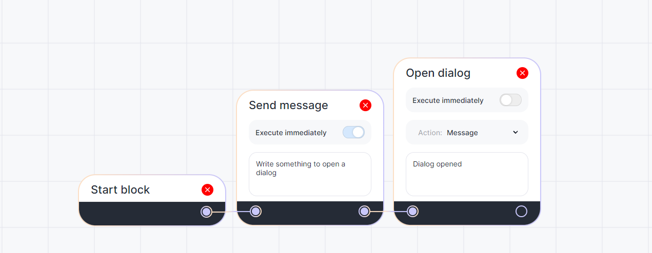 The block can perform an action immediately after the previous one or in response to the client's message. In the example on the screenshot the "Open dialog" block is triggered after the client replies to the bot's message.