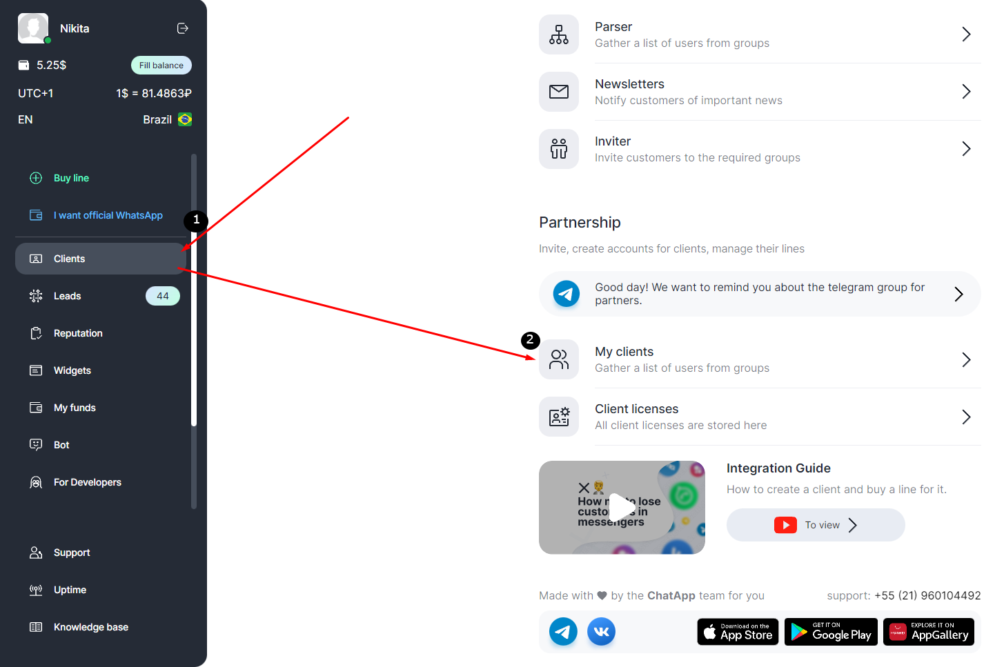 1. To view the list of clients, go to your ChatApp Personal Account and select «Clients» in the left side menu.