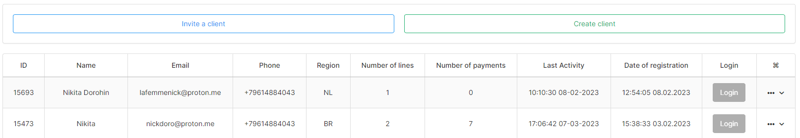 - Each created or invited client will be reflected in this table.
