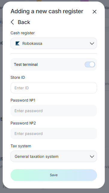 - Store ID or terminal ID — enter the store ID for the Robocass or terminal for the T-bank;