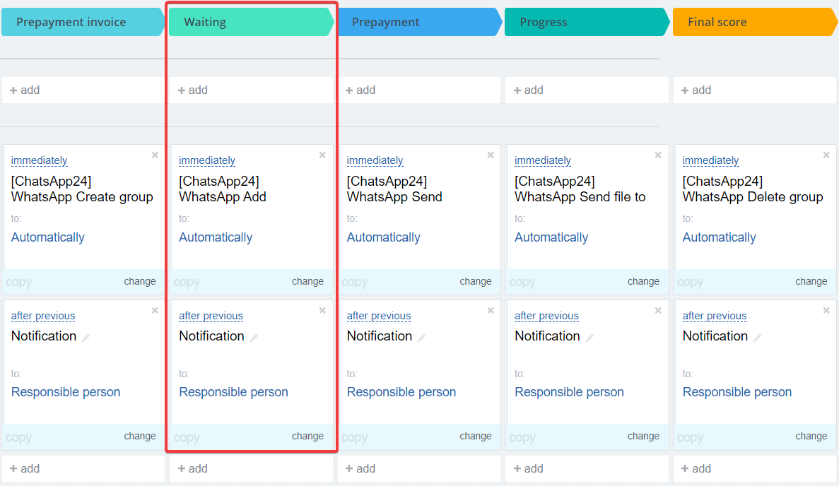 - Add the Automation rules for a deal, for example, in the Waiting stage. Use the standard procedure for setting up ChatApp Automation.