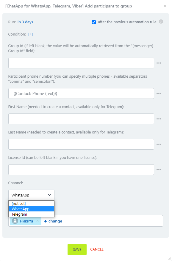 The Automation rule is created so that after the transition of the deal to a certain stage, the WhatsApp or Telegram number is automatically added to the already-created group
