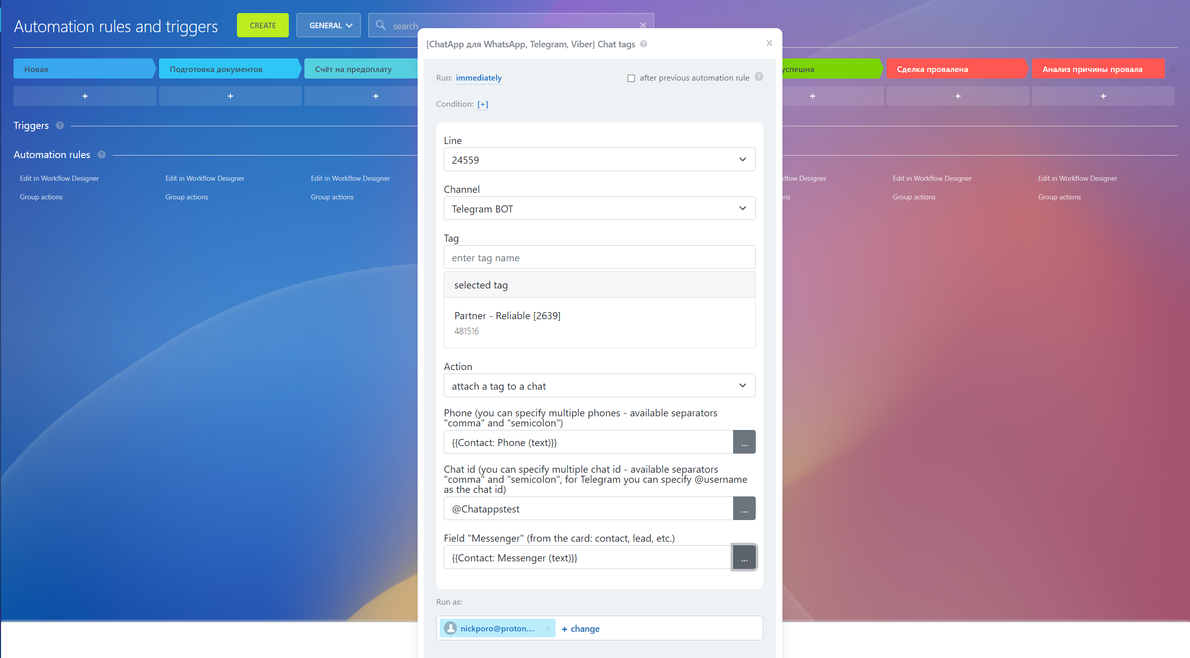 - Messenger - here you need to specify the "Messenger" field from the deal or lead card through the field mask. This field is required when the contact's phone number or other details are not available.