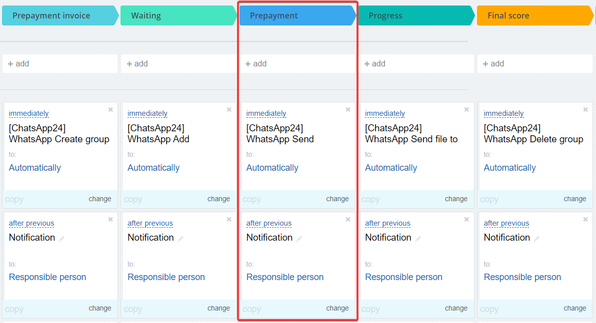 1. Add a ChatApp automation rule - Send a message to a deal, for example at the Prepayment stage.