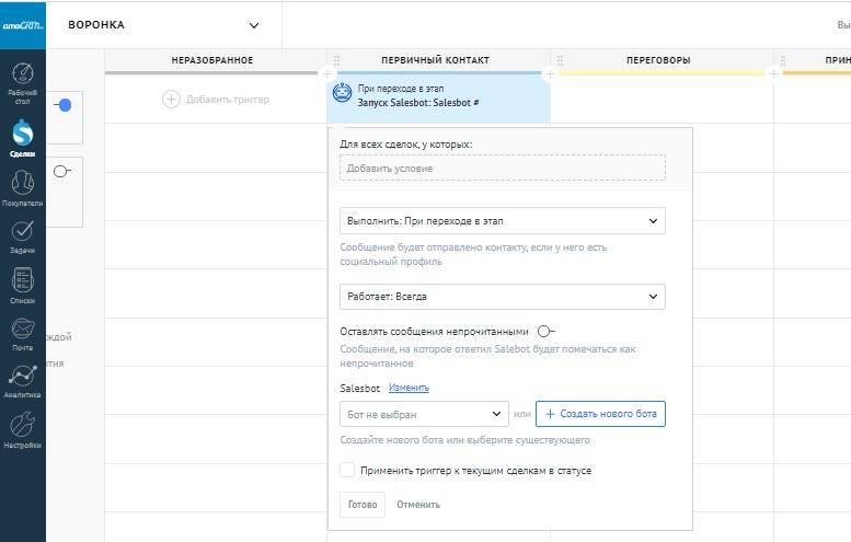 - After adding Salesbot, go to the visual editor of the bot by clicking on the button "Create a new bot".
