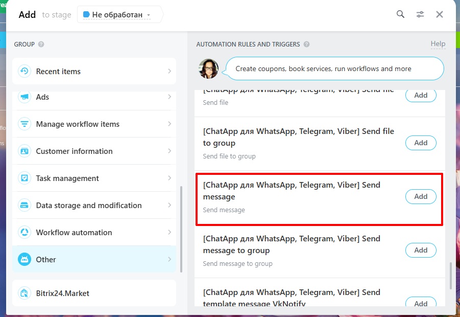 - Go to the Bitrix24 platform and add a new robot to the selected stage of the transaction.