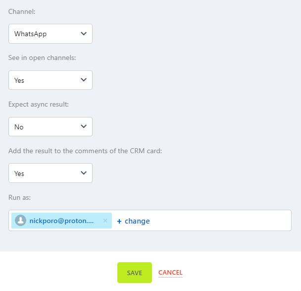 - Add result to CRM card comments — Display message sending status.