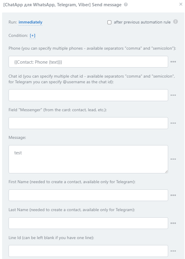 - Chat ID — specify the chat id from the web chat ChatApp WEB or @username of the Telegram user if the phone number is not available.