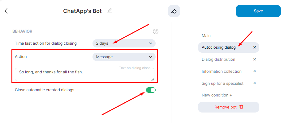 - If you want to automatically close the dialog - select "Auto close dialog" in the main settings of the bot. Here you can specify: