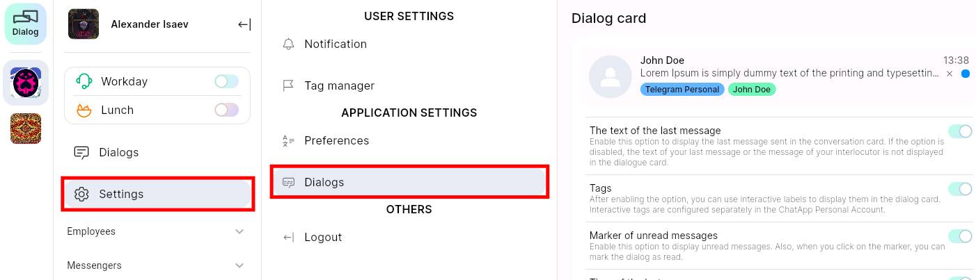 In Dialogs.pro you can configure cards of dialogue and settings for messenger. To do this, go to the "Settings" menu in Dialogs.pro and select the sub-menu called "Dialogs".