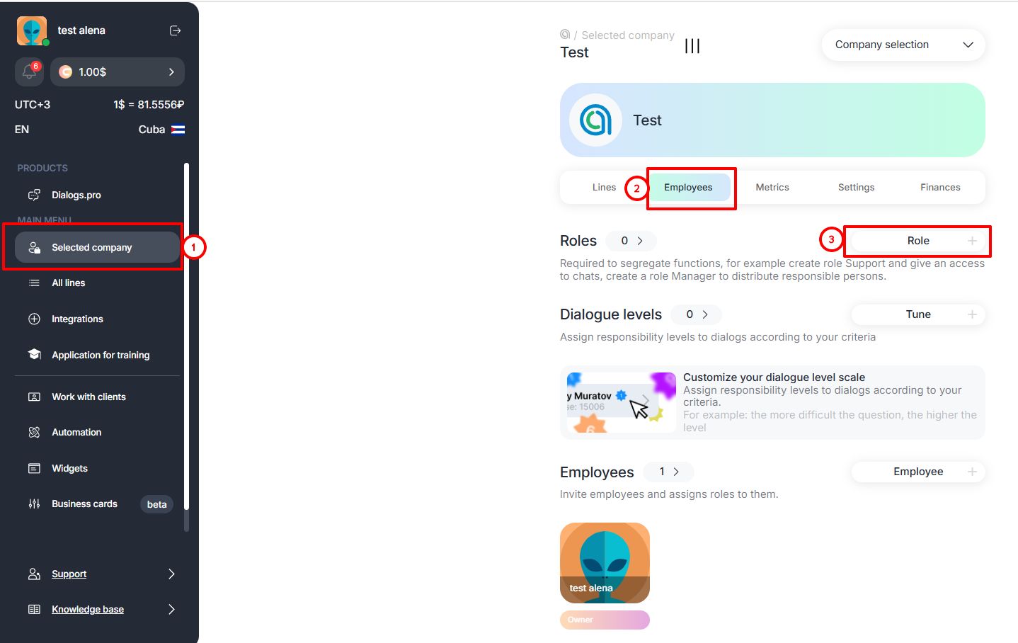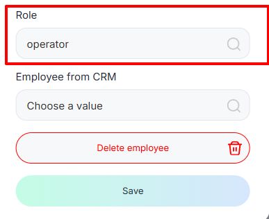 The first thing you do is to create a role. This is necessary to differentiate the functionality, for example, create an Operator role and give access to chats. Create a Manager role to assign responsibilities. Then invite employees and give them access to Operator or Manager.