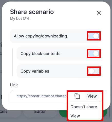5. Select the copy options you want to activate. In the "Link" field, click "View";