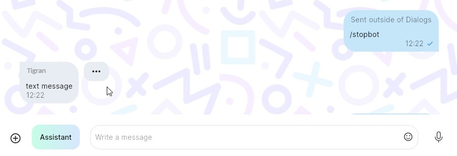 For example, if the chat bot requests additional information from the client and it is necessary to interrupt the bot's work, then the command is used /stopbot