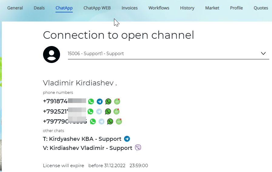 To open the existing dialog in Bitrix24 go to contact, lead, or transaction card in the ChatApp tab.