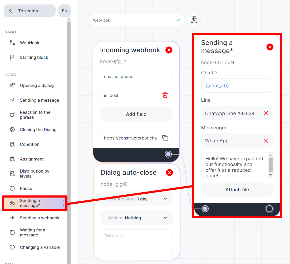 3. Set the “Send message*” block: Use the “{{chat_id_phone}}” variable, select the messenger and write the message text to send a message to a specific user.