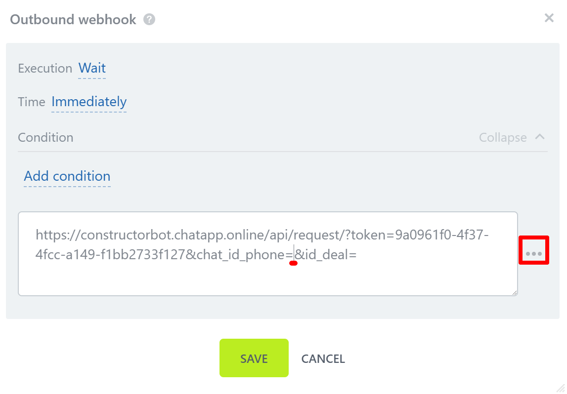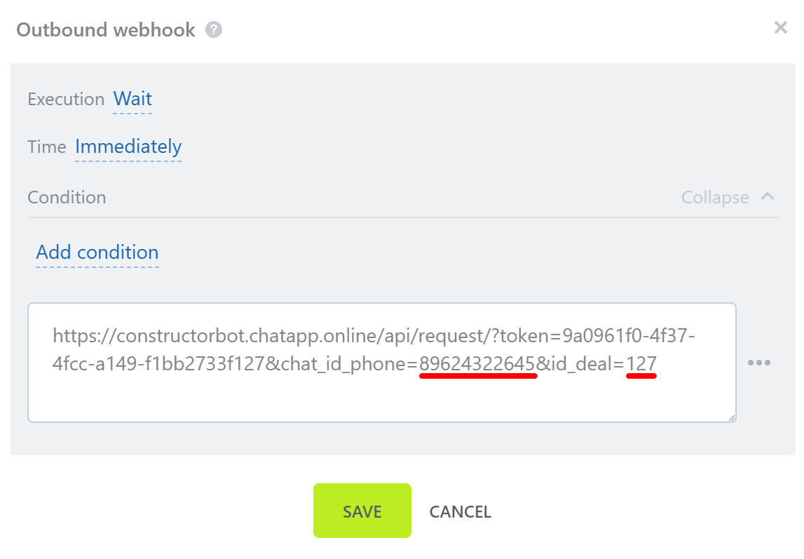 3. Create an “Outgoing Webhook” robot at the first stage of the sales funnel. Our outgoing webhook will call the bot constructor script (the link to the script was copied in the first part of the article when preparing the script). This will allow data to be exchanged between the two systems. Let's link the deal to the scenario using the deal ID and client contact number.