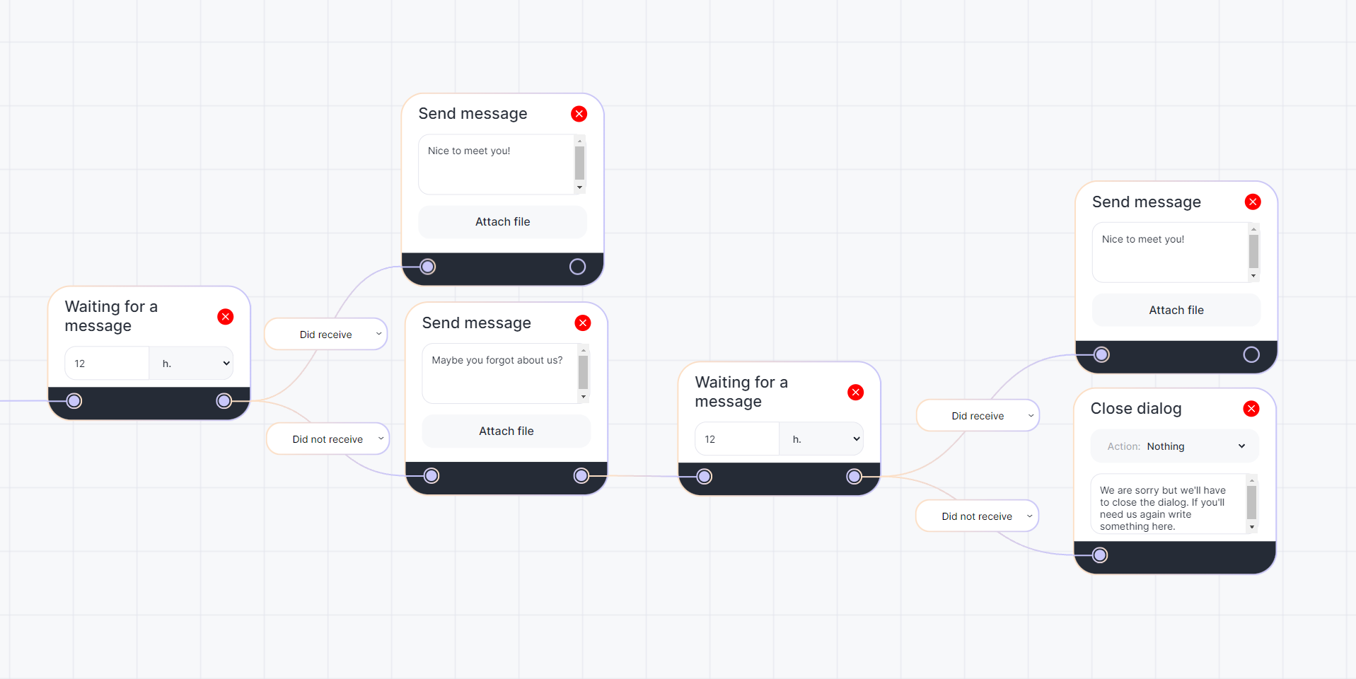 Two directions can be output from the "Waiting for message" block. The "Did receive" direction will be triggered if the client has replied to the message. The "Did not receive" direction will be triggered if the time you set has expired and the client still has not responded.