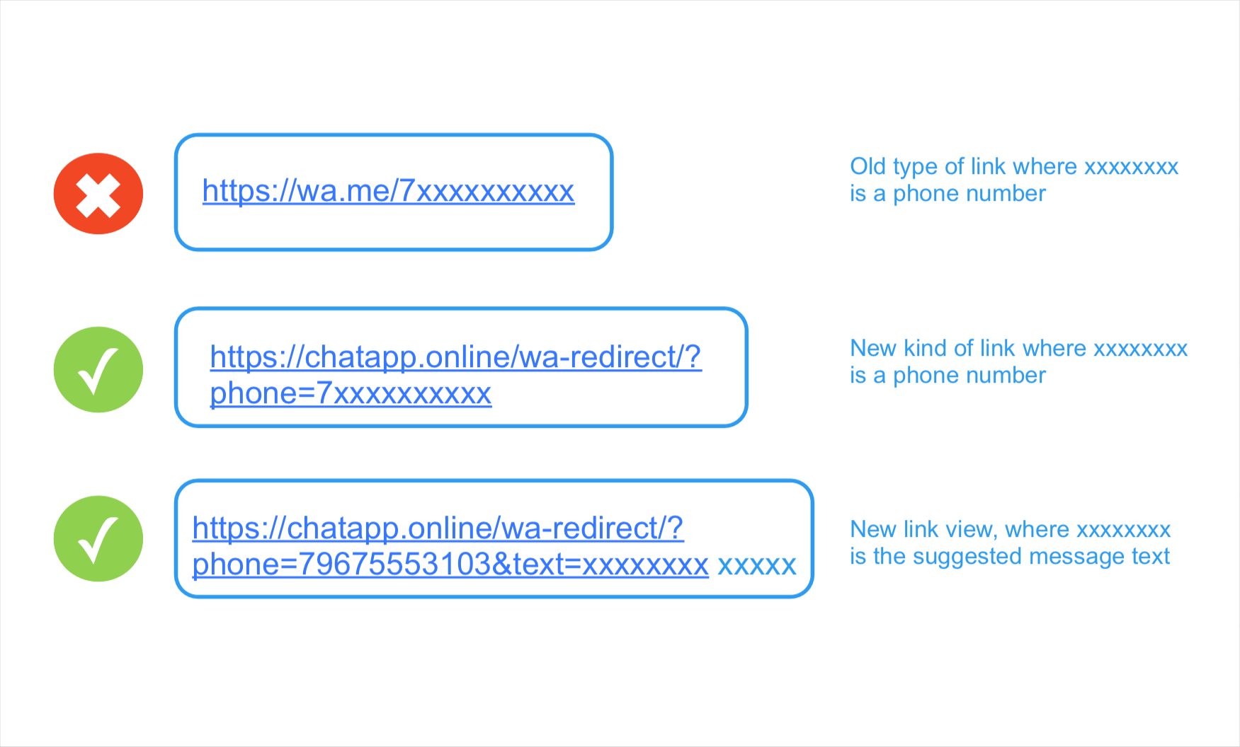 Unfortunately, this type of link may not work correctly, so ChatApp suggests using links with the form: https://chatapp.online/wa-redirect/?phone=7xxxxxxxxxx, where “хххххххх” is the contact's phone number.