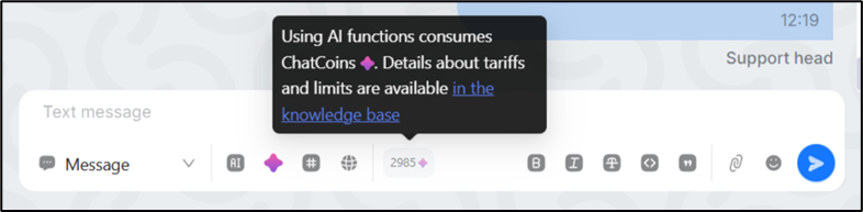 - At the bottom of the dialog area, under the message input field, click on the "ChatCoin" icon
