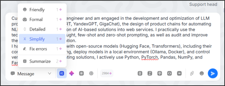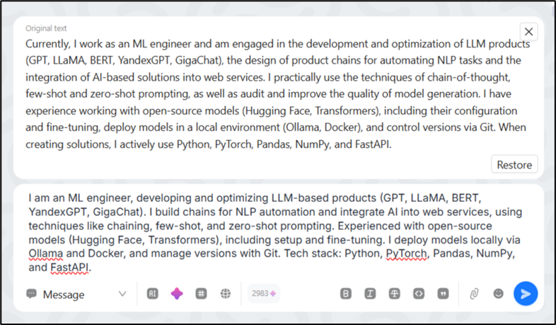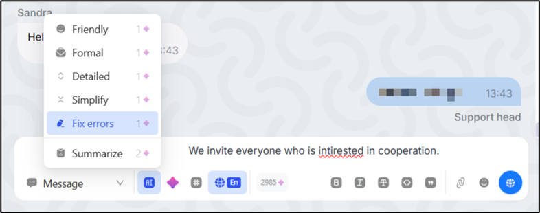 When communicating with a client, it may be necessary to change the text of a message in order to give it a certain tone of communication, simplify it, or make it more detailed.