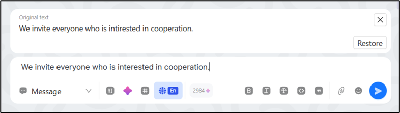 The assistant will correct the text in the message and display a window above the message with the original text and the option to restore it.