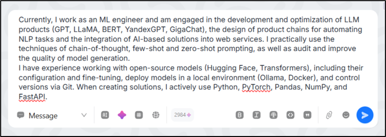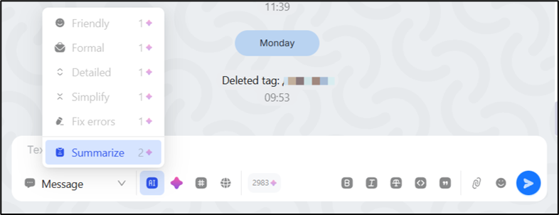 AI-request counter right in the message sending window. Now you can always see how many AI requests a company has remaining. The counter automatically decrements when you use any AI function.